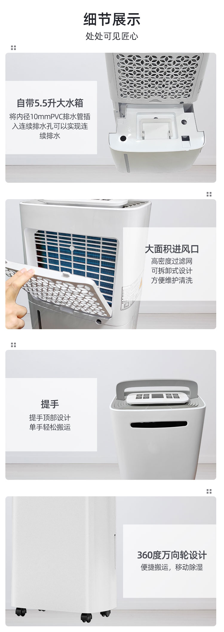 7.水箱容量和排水方式:兩種排水方式,不僅僅有5.5L水箱排水還提供了連續(xù)排水方式,可以將除濕機(jī)直接連接到排水管道,避免頻繁倒水的麻煩。